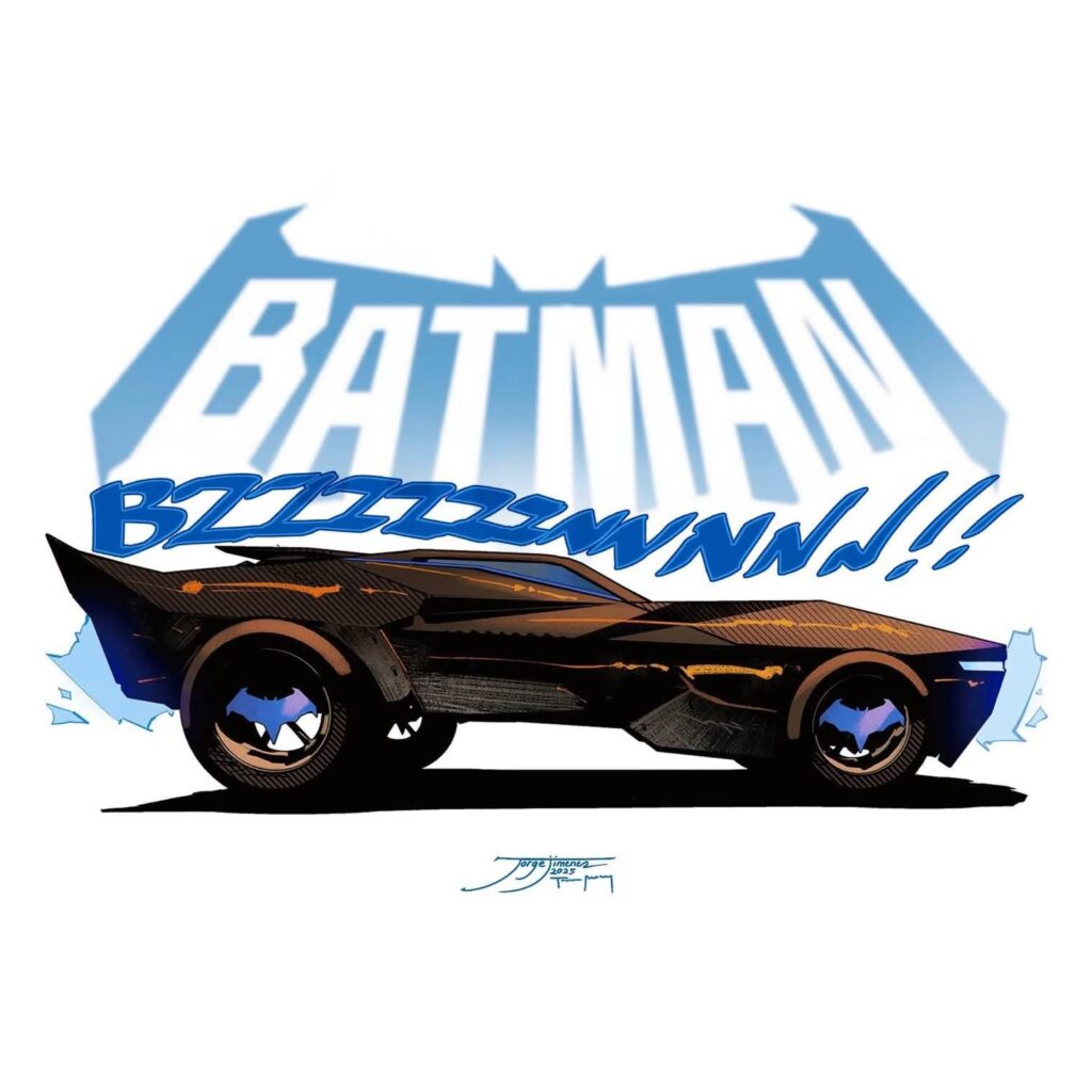 Nuevo Batmóvil: diseñado por Jiménez, con estética retro-americana, grande, eléctrico y muy rápido, como si salido de un videojuego de carreras.
